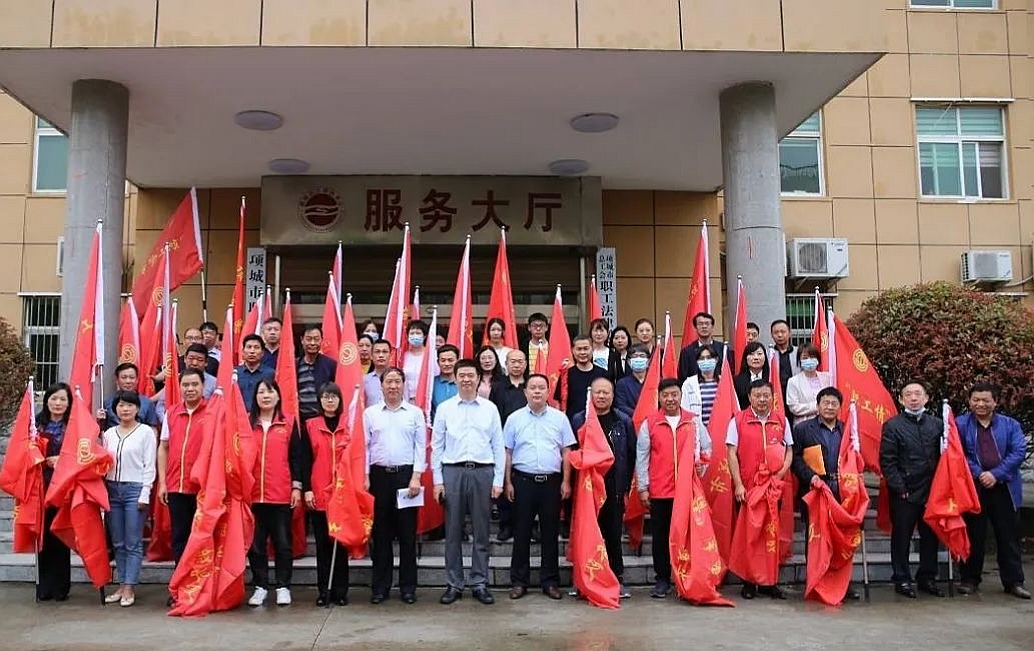 启动仪式上,刘玉世为50支“职工情”志愿服务队伍授旗。启动仪式结束后,市总工会领导与各队旗手合影。