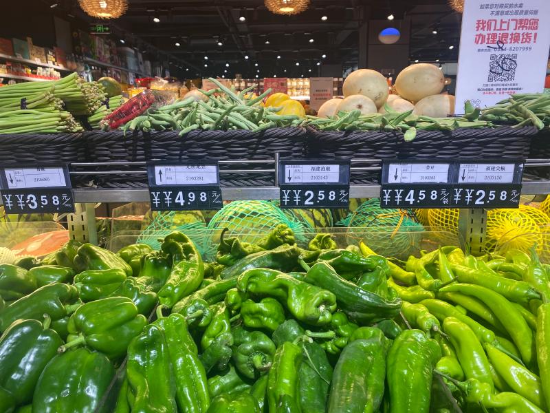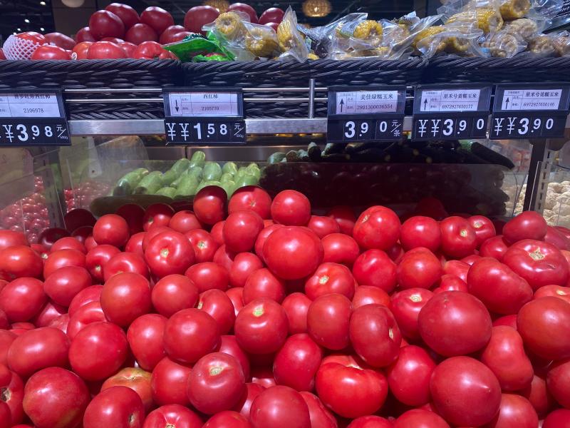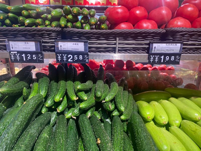 “进入5月份后,气温越来越高,各种蔬菜陆续上市,黄瓜、西红柿、包菜、青椒......不少蔬菜价格较前期小幅下降。”万果园蔬菜采购经理顾金波说。