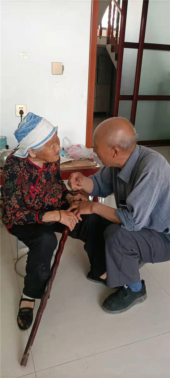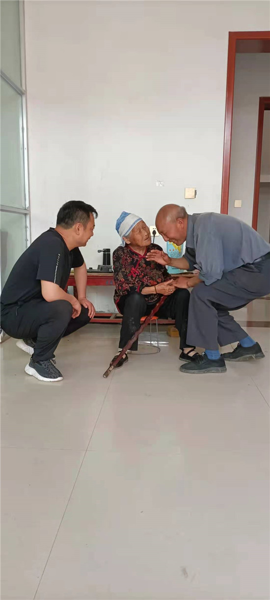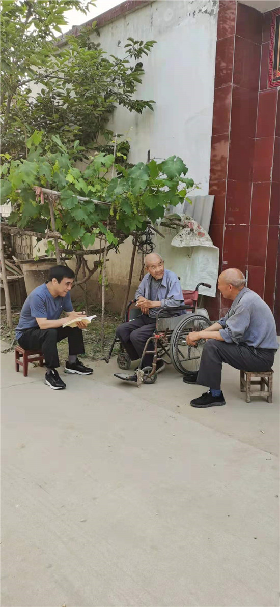 西华县退役军人事务局工作人员陪同薛景洪走访知情老人。