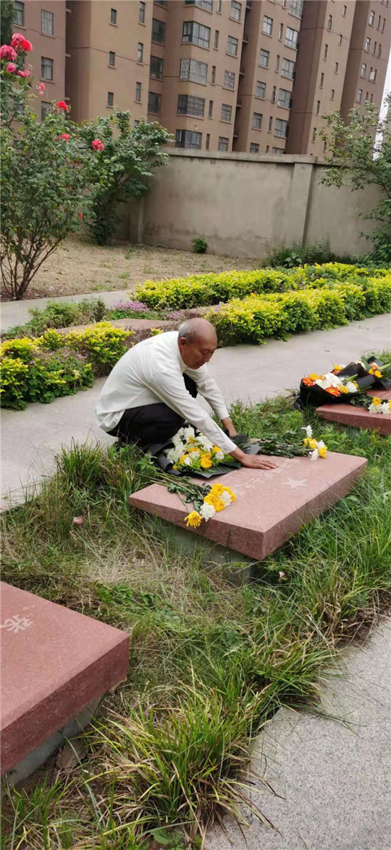 5月12日上午,尉氏县烈士陵园内,一排排墓碑安静地排列在鲜花绿草中,来自西华县东王营乡薛庄行政村74岁的村民薛景洪等在刻着“薛子明烈士”的墓碑前三鞠躬,表达对烈士的悼念。随后,薛景洪蹲下身子轻轻抚摸着墓碑陷入沉思。他说:“虽然现在还没有证据认定薛子明就是我失散多年的叔叔,但我感觉他就是我的亲人,是我们薛庄人的亲人,是薛庄全村人的光荣。”
