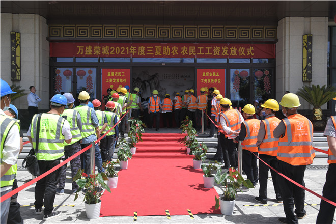 5月28日,商水万盛荣城举行“三夏助农”农民工工资发放仪式,以近千万现金现场结算农民工工资,让600余名项目建设者带着沉甸甸的劳动成果幸福返乡,提前享受到丰收的喜悦。