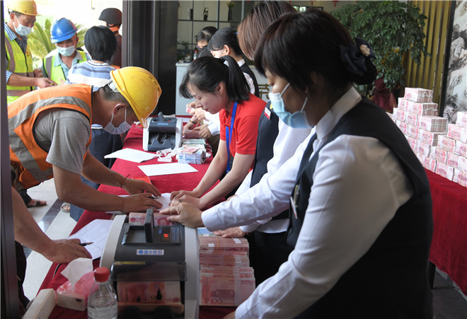 当天上午10点,县农商银行的运款车准时来的万盛荣城营销中心门前,一摞摞百元现金摆在一起煞是壮观。在东城街道办事处、县住建局、劳动局、东城派出所等单位负责同志的监督见证下,农民工排着整齐的队伍有序走到结算桌前,核准数额,领取现金,手里拿着两三万现金的农民工个个喜笑颜开。来自化河乡的工人赵志伟表示他已不是第一次参加这样的现金结算活动,每次拿到现金都让他兴奋不已,这样的企业让他格外心安。他从商水万盛荣城项目一开工就在这里工作,每次工资发放都很及时。返乡收麦后,他会和工友们一起尽快回来,共同把万盛荣城项目高质量的建好。