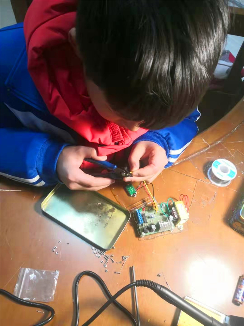 他经常说:“我将来要当一名科学家,搞发明创造,为人民造福,为国家做贡献。”别看年纪小,但是搞起小发明、小制作一点也不含糊。他在给自己命名为“博士生的小屋”里认真钻研相关书籍,学习电子制作、电气知识、物理化学、少儿编程等方面的知识。有了想法就亲自动手画设计图、网购原材料、选料切割、组装焊接,经常一忙就是几个小时。他的房间内备有烙铁、热熔胶枪、热风枪、电压表、电源及各式改锥、形状不一的镊子、大小钳子、壁纸刀、各种规格的扳手、不同型号的电池,甚至还有灰水泥、白水泥、小砖头等建筑材料。