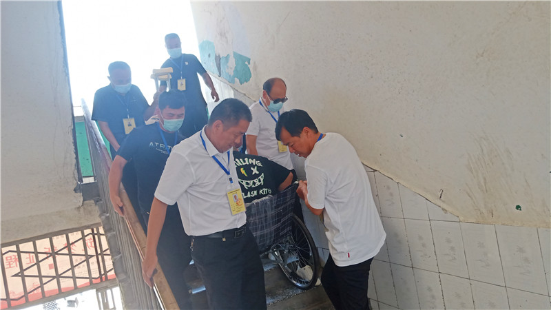 “要以生为本,为考生服务,把他抬进考场!”考点负责人决定。随即,四位工作人员迅速到位,合力将他抬进二楼考场。考试结束后,工作人员又把他从二楼考场抬下来,推到家长身边。