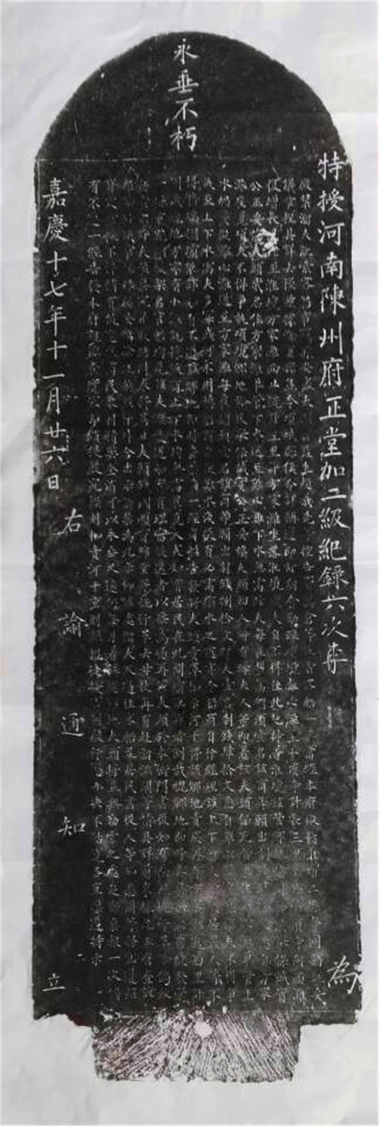 说它“缄默不语”,其实并不准确。这通石碑通体有字,碑的阳面为清同治八年四月十六日淮沈项分县县丞孙茂悟所刊刻的严禁溜夫讹索客船事告示,碑的阴面为附文,内容为重刊的清嘉庆十七年十一月二十六日陈州知府李振翥制定的严禁溜夫讹索客船事章程,是对公告内容的重申,两面碑文内容大致相同,加起来共有1100余字,均为约束溜夫行为的公告或章程。碑首追刻的有四个大字:永垂不朽。