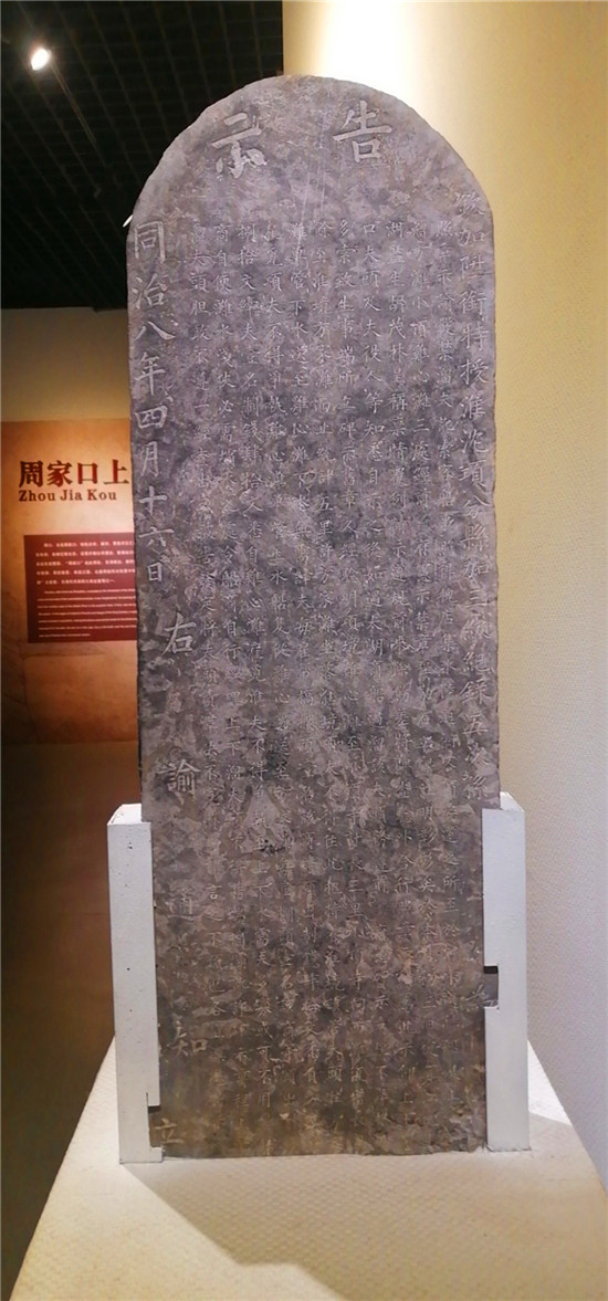 在周口市博物馆三层东侧的展厅“逐波兴埠”里,有这样一通碑刻:它通体由青石材质制作而成,高120厘米,宽40厘米,厚8厘米,两面刻,均为阴文楷书,碑名为《严禁溜夫讹索客船事告示碑》。在周口市博物馆为数不多的碑刻文物中,这通石碑是我市迄今发现的唯一一件约定溜夫行为、确保水运秩序的文物,对研究周口水运史具有重要的历史考古价值。