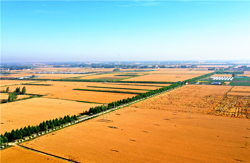 通过航拍器,记者看到,田成方、林成网、渠相连、路相通、旱能浇、涝能排的高标准农田,已是被誉为中原粮仓的郸城县一幅壮美的丰收图景。三夏,这幅图景的底色便是一片金黄。
