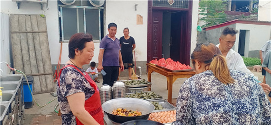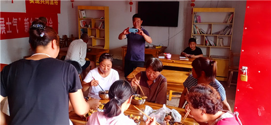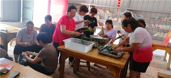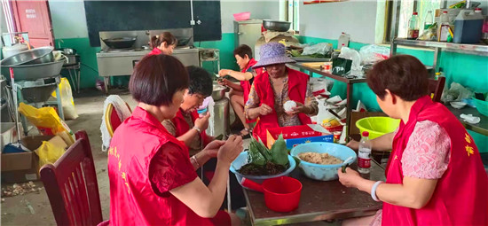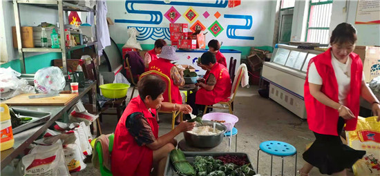 6月14日上午,西华县奉母镇七二村、前邵村、刘庄村的乡村大食堂里笑声不断,“两委”干部、文艺宣传队员将粽叶、糯米、红枣、花生等食材仔细洗干净,一起折粽叶、装糯米、放馅料、裹扎绳……大家相互指导、相互配合,一派“碧艾香蒲处处忙,谁家儿女庆端阳”的热闹景象。