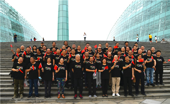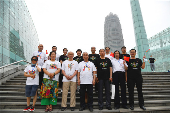 穿着印有周口文化元素符号“泥泥狗”T恤衫的省内艺术家们
