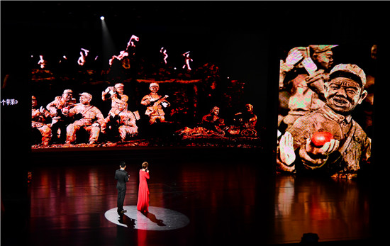 整台晚会按英雄之光、信念之火、出彩之路三大篇章进行,演出了省直十三家协会报送的16个精彩文艺节目。在第一篇章英雄之光中的“山花别样红”剧目中,展示了省民协报送的省内三位艺术大师的作品,其中周口市民协副主席张振福创作的华诞百年献礼作品《上甘岭·一个苹果》,最为震撼,作品“还原”的是中国人民志愿军老战士93岁的张计发讲述的上甘岭战役中,由于连续断水,一个苹果,8个战士传递三圈才吃完的动人故事,弘扬了我志愿军奋勇抗敌、鏖战卫国的精神。张振福等三位艺术大师被邀请到现场和观众见面,现场观众及文艺界人士以热烈的掌声表达对三位艺术大师的致敬。