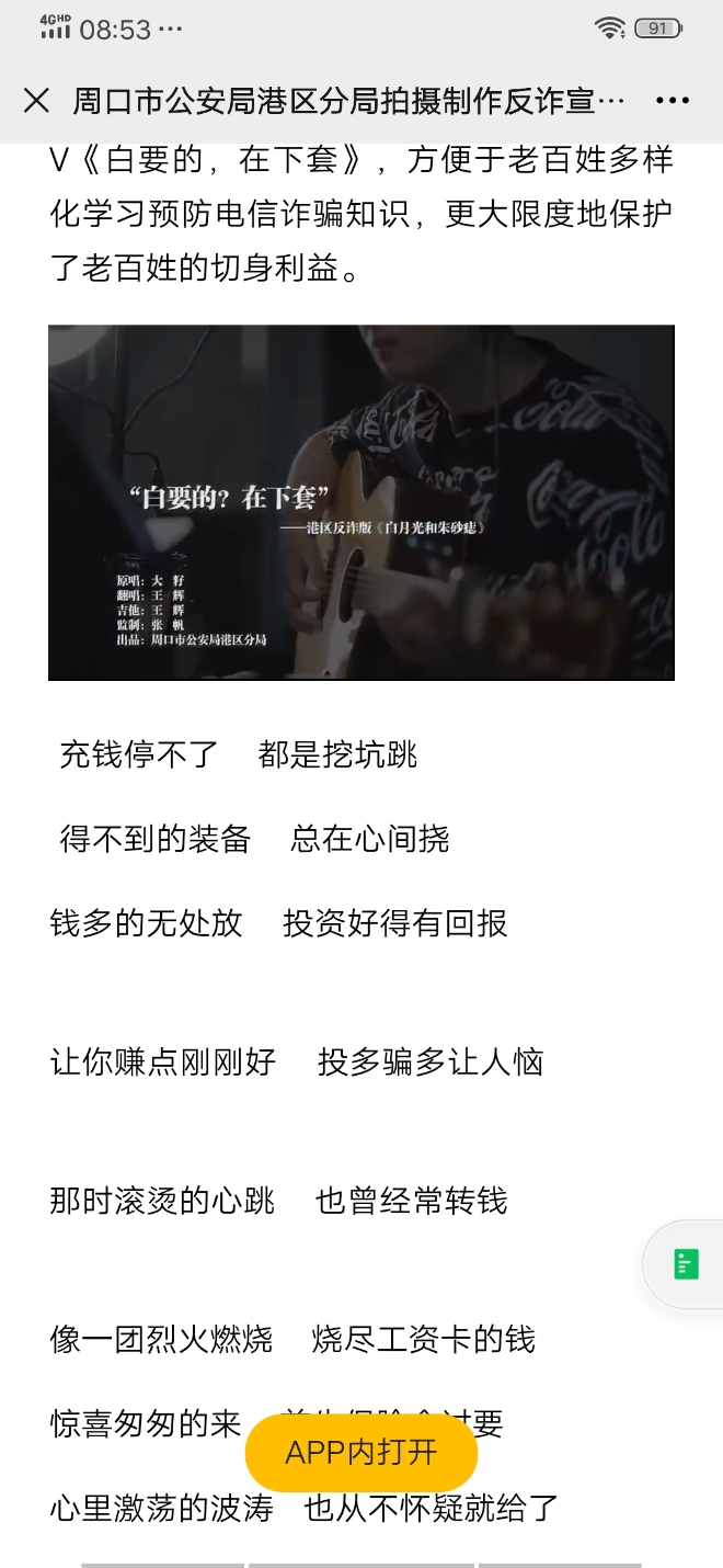 “白要的在下套,你才想起被骗了,骗术有很多样,你是否能知道,要记住一句话,骗贪心的人容易,不轻信不转账,不贪便宜。”日前,一首由周口市公安局港区分局拍摄的反诈歌曲MV《白要的,在下套》出现在网络上,受到市民朋友的热捧。