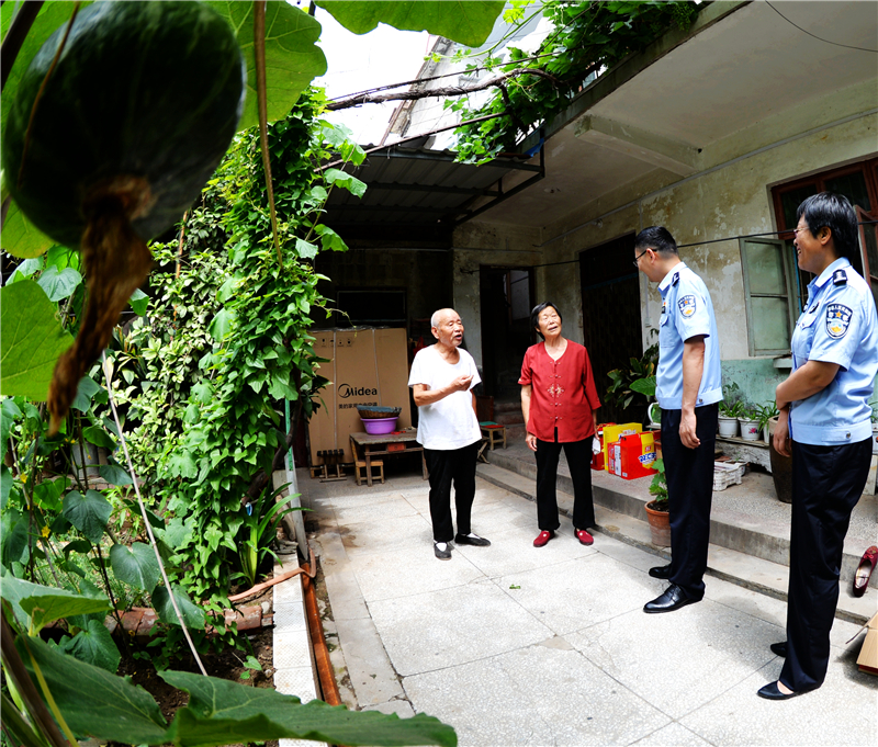 6月20日,父亲节,商水县公安局组织民警到因公牺牲的公安民警李永杰家中走访慰问,祝福他的家人身体健康。据悉,2010年12月16日夜,商水刑警李永杰在抓捕命案犯罪嫌疑人途中遭遇车祸,生死瞬间,救出两名战友,牺牲时年仅42岁。李永杰牺牲后,先后被追授革命烈士、二级英模(周口晚报2010年12月22日曾报道)。图为该县公安局政委张俊华(右二)与李永杰的父母交谈。