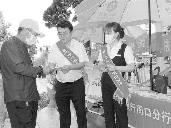 6月18日,郑州银行周口分行在五一文化广场开展防范和打击非法集资集中宣传活动。该行通过设立服务台和展板、发放宣传手册、以案说法等形式,向过往群众介绍非法集资的特征、表现形式、常见手段及社会危害和正确的理财方式等,教育群众自觉抵制高息诱惑,远离非法集资,为我市高质量发展营造了良好的金融生态环境。 记者 徐如景 通讯员 周琳 摄