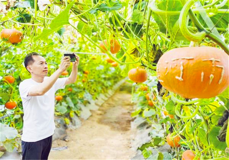6月18日,河南农业大学扶沟蔬菜研究院的蔬菜大棚内硕果累累,多彩的瓜果蔬菜很是诱人。