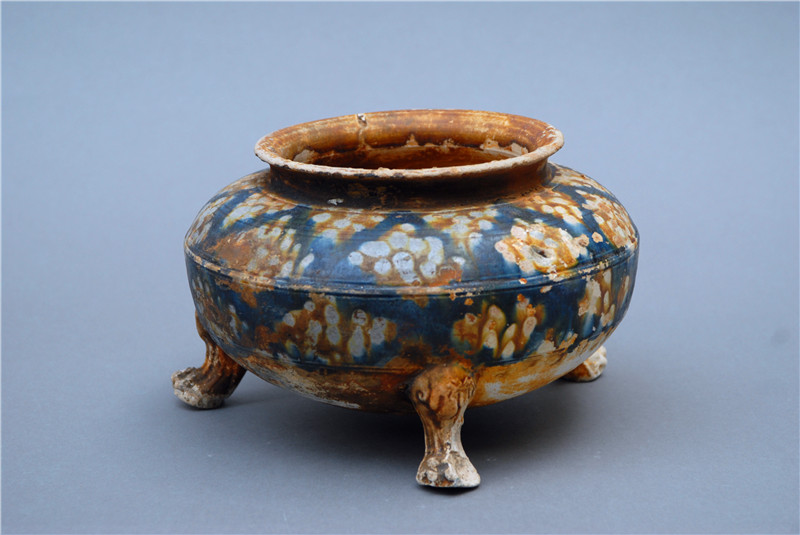 1998年10月,沉睡许久的唐蓝釉三彩炉迎来了它的今世。周口市农村信用社在建工地上,发现了一座唐代墓葬。在其中沉睡的唐蓝釉三彩炉被吵醒,来到了它的新家——周口市博物馆。它敞口,圆唇,短立径,弧肩,鼓腹,下有三兽蹄足支撑它站立,样貌圆润饱满,与唐代艺术丰满、健美、阔硕的特征是一致的。唐蓝釉三彩炉不仅体现了唐代人的制陶工艺和智慧,更是丝绸之路与中西文化和物资交流融合的见证,浑身散发历史与艺术的魅力。