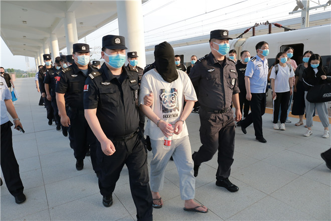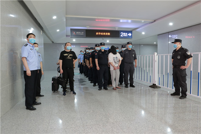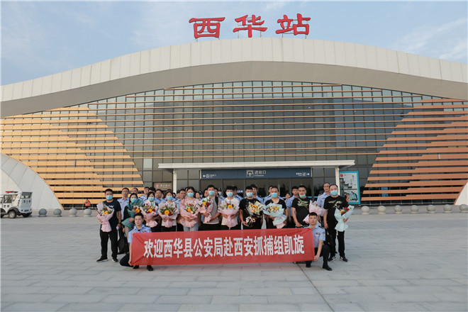 当天,西华县公安局在郑阜高铁西华站举行欢迎仪式,迎接赴西安抓捕组凯旋归来。特警在站台上排列整齐、严阵以待,列车准时停靠到站,7名犯罪嫌疑人随即被押解下车,全副武装的特警立即上前进行押解交接,押往在高铁出站口等候的装甲车上。至此,历经三天三夜,一起电信网络诈骗团伙案成功告破。