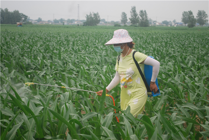 三夏时节,商水县巴村镇农民抢抓农时,加强对秋田作物管理。图为该镇黑朱村农民正对玉米化控除草。