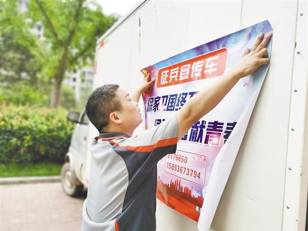 外卖小哥在车上张贴征兵宣传海报