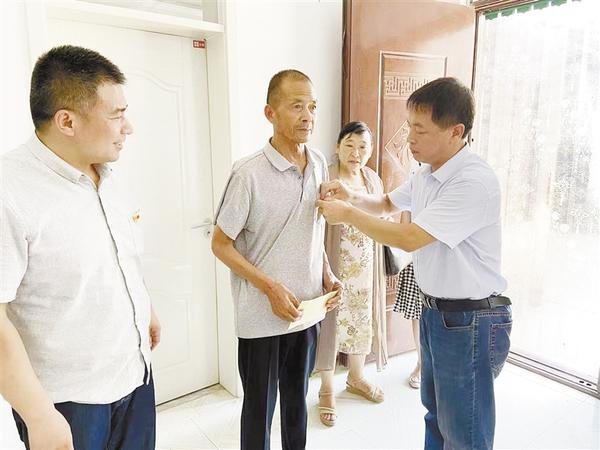 家住朱庄村四组的郭恒志是一位有着近70年党龄的老党员,参加过渡江战役、解放西藏、抗美援朝等战役,多年来为党默默奉献。驻村工作队员刘向东为郭恒志佩戴党徽(如图),送上慰问金及诚挚的祝福,叮嘱老人保重身体,继续发扬老党员先锋模范作用,带动年轻党员干部紧紧凝聚在村党支部周围,多支持村里的工作,为乡村发展作出贡献。
