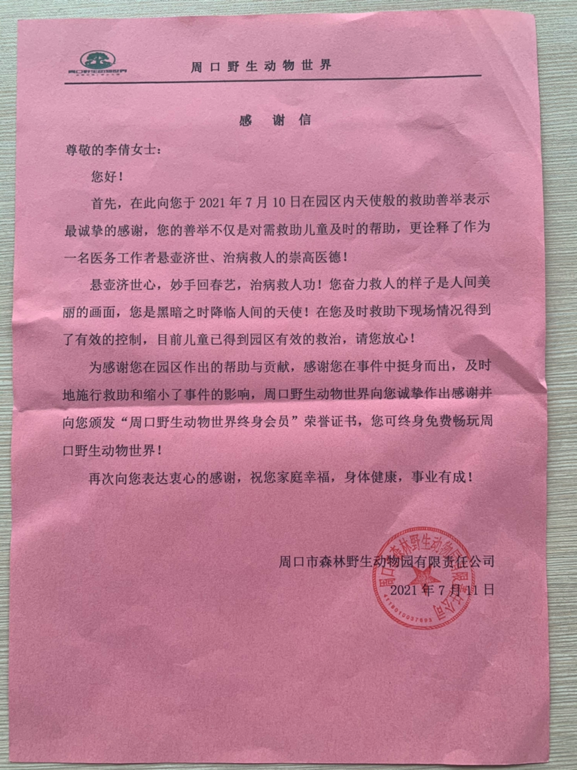 11日下午,周口野生动物世界工作人员向李倩送上了荣誉证书和感谢信。信中称,为感谢李倩在园区作出的帮助与贡献,感谢她在事件中挺身而出,及时地施救和缩小了事件的影响,周口野生动物世界作出诚挚感谢并颁发“周口野生动物世界终身会员”荣誉证书,她可终身免费畅玩周口野生动物世界。