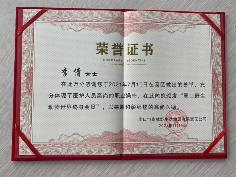 面对荣誉,李倩说:“救死扶伤是医生的本分,这都是我应该做的。谢谢广大网友的赞美和周口野生动物世界给我的这份荣誉。”