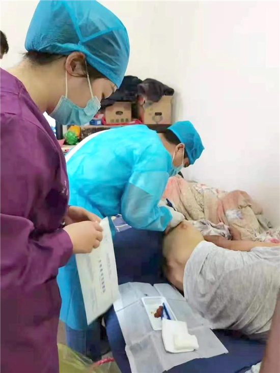 当医护人员穿着白大褂手捧鲜花,背着药箱走进村子,来到患者家中时。医护人员一声“杨大爷,我们是中心医院的医生,来看您了!给你检查一下身体”,老人感动至极,痛哭流涕。在大家的劝说下,老人心情转好,憔悴的脸上露出了光彩。医护人员探下身去,轻声细语地询问,认真查体、听诊、测量血压,一起为患者翻身,查看骶尾部压疮情况,评估后进行消毒、清创、上药,并向家属讲解压疮预防的相关知识,传授翻身拍背、按摩的技巧。随后,又指导家属氧气湿化瓶更换方法及氧气瓶使用时的注意事项等。