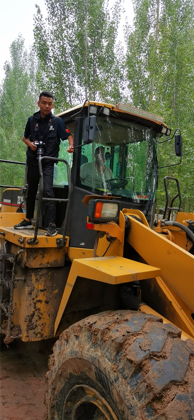 记者李龙周来到扶沟县曹里乡贾鲁河摆渡口大闸附近,为找到更为合适的拍摄角度记者爬上了救灾铲车。