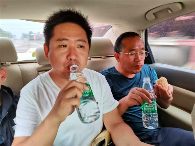记者连续在扶沟贾鲁河防汛一线采访一整天时间,图为周口日报记者张劲松、张洪涛在采访车中吃饭。