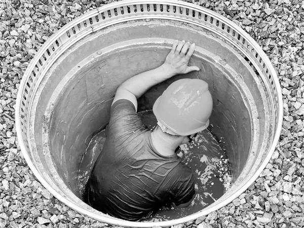抢修人员跳入深井对排水口进行封堵。 童之洁 摄