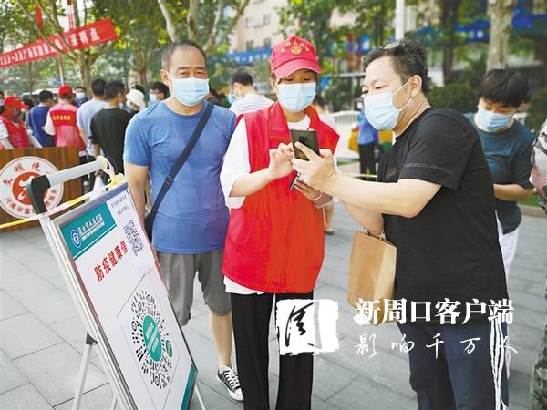 8月8日上午,周口市人民医院在五一文化广场开展核酸检测集中采样工作。在广场上,一群“红马甲”有的手持扩声器、有的帮忙测量体温、有的分发口罩,核酸检测采样现场秩序井然。③7