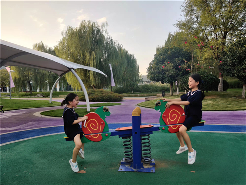 电影电视里的旋转木马曾经是无数周口人的童年渴望,童年的记忆最难忘,如今的周口环境优美,游园众多,游园里的跷跷板、旋转木马、彩虹桥等给了孩子游玩释放的空间,让他们的童年有了多彩的空间。图为孩子在建业绿色基地快乐玩耍。