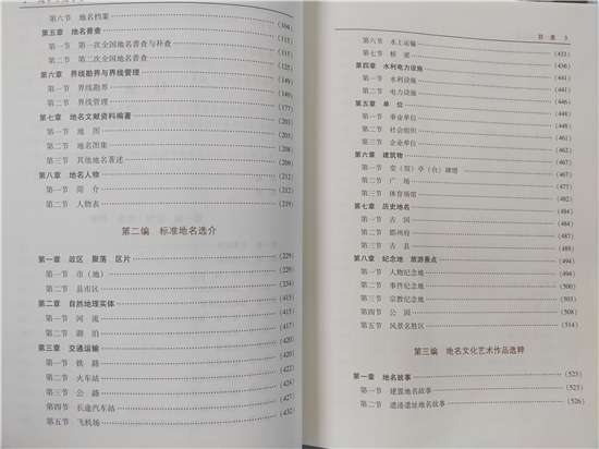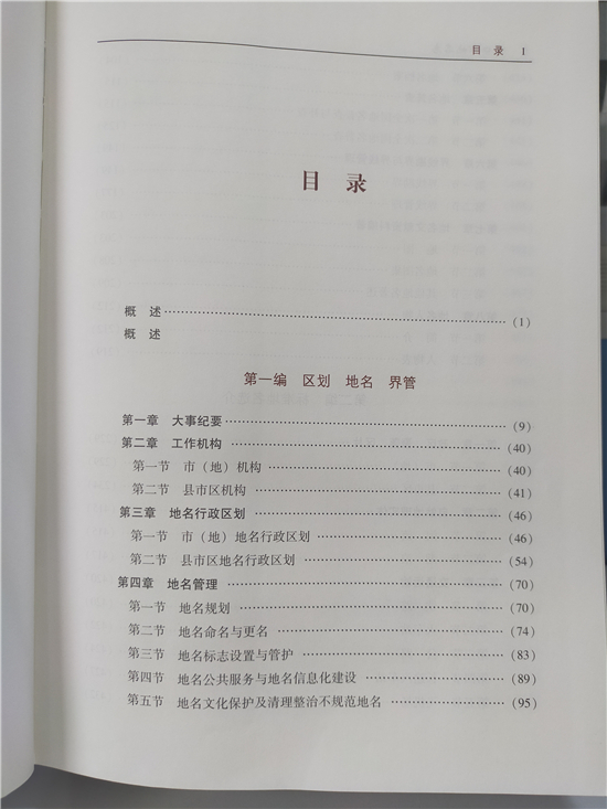 全志主体分为三大编、二十五章,采用序、图、凡例、目、述、记、录等形式,前置序言、图片、大事纪要等;后置附录、编后记;中间主体内容分为区划、地名、界管工作、地名文化艺术作品选,标准地名选介,共计100余万字,近100节。