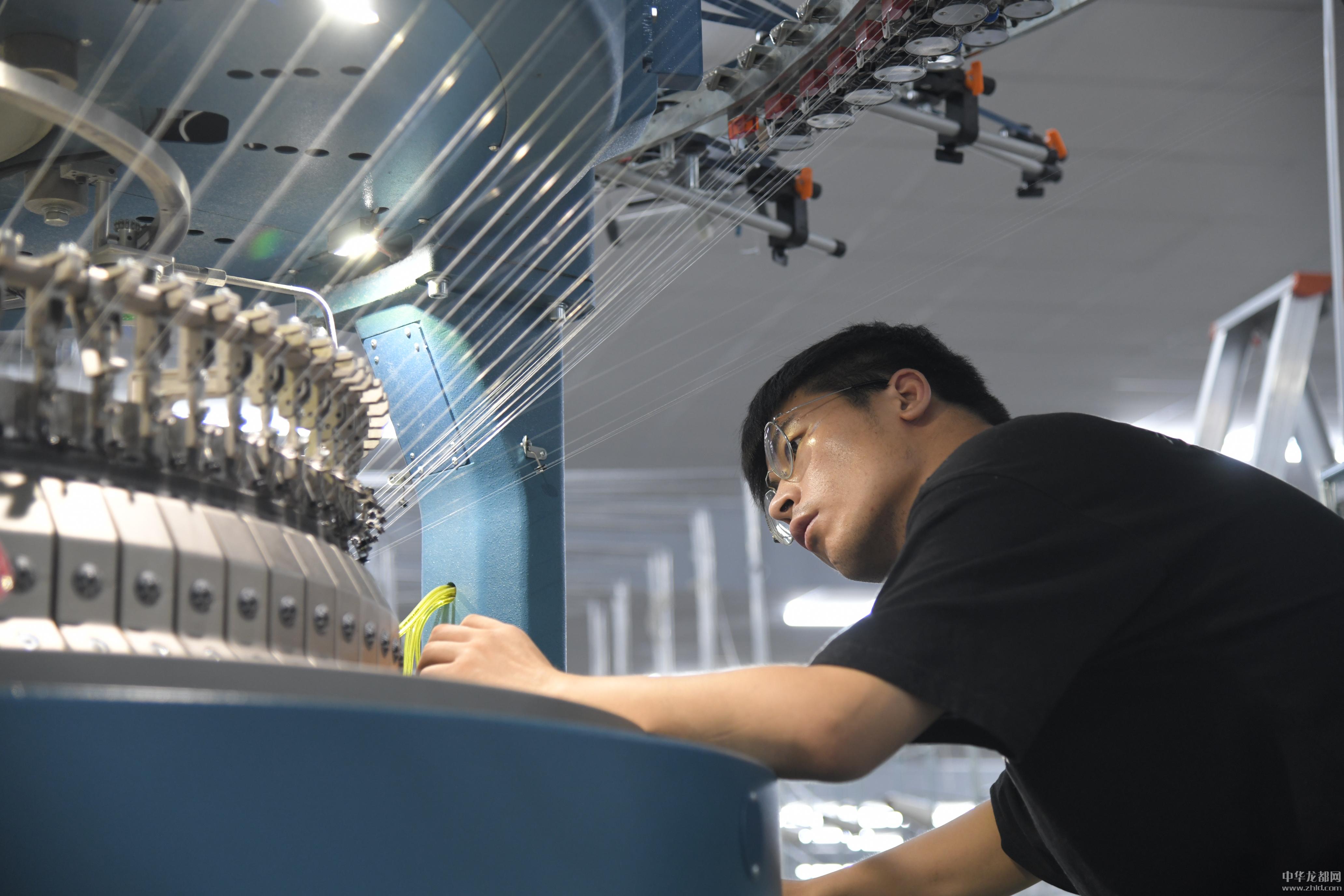 图为8月26日商水县盛泰浩邦纺织工业园区工人在查看针织大圆机运行情况。