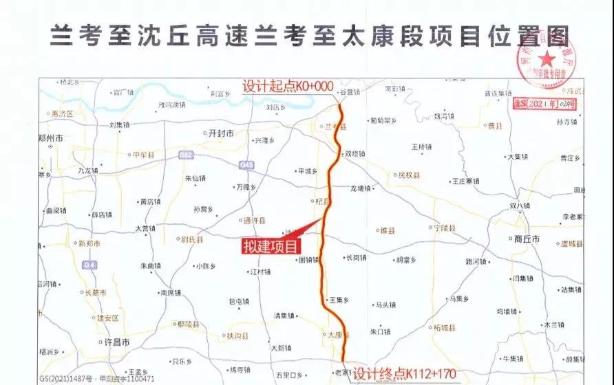 兰考至沈丘高速兰考至太康段拟选起点位于兰考县谷营镇接日兰高速设置谷营枢纽,由北向南依次经过兰考县、民权县、杞县、太康县,终点接盐洛高速并设置符草楼枢纽。