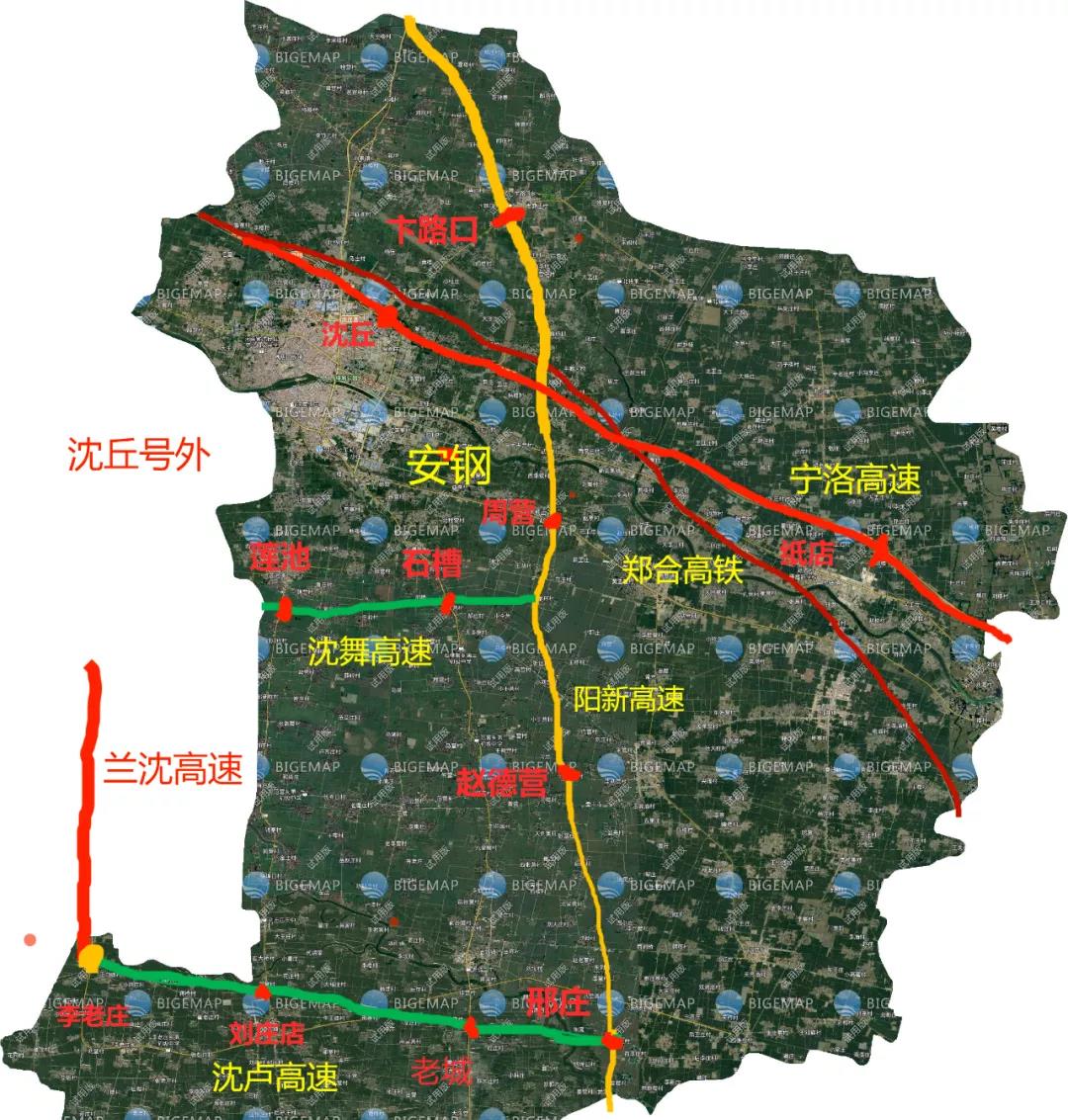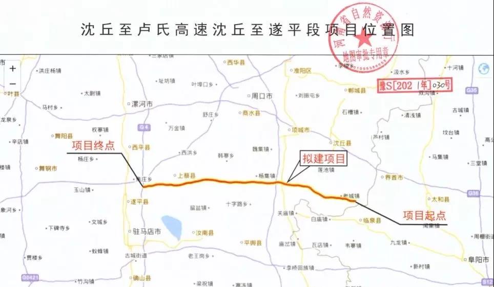 沈丘至卢氏高速沈丘至遂平段拟建路线起点设在沈丘县阳新高速上(阳新高速桩号K22+075),向西经邢庄镇、老城镇、刘庄店镇、李老庄乡进入项城市。经项城市付集镇、新桥镇、高寺镇、秣陵镇、孙店镇进入驻马店上蔡县。经上蔡县黄埠镇、杨集镇、蔡沟镇、和店镇、党店镇、塔桥镇、洙湖镇、齐海乡、重阳街道办事处、芦岗街道办事处、邵店乡、大路李乡、无量寺乡、五龙镇进入遂平县。经遂平县常庄镇、和兴镇,在和兴镇东火龙庙村附近设置枢纽互通接京港澳高速。