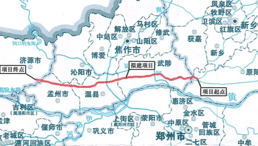 其中,沿黄高速公路武陟至济源段拟选起点位于新乡市平原示范区祝楼乡西南,与晋新高速公路相接,向西经焦作市武陟县、温县、孟州市、济源市东,止于济源市轵城镇东,与菏宝高速公路顺接。