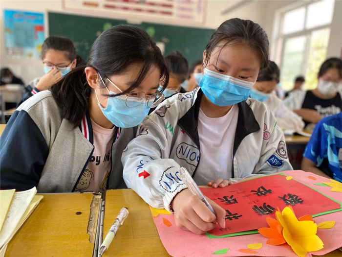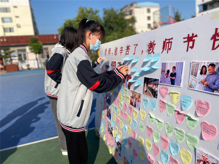 在此基础上,学生用展板展示教师教学中的教育和关爱学生的照片,学生把对老师的祝福写在便利贴上,贴到展板上,一张张的便利贴迎风飘动,成为校园一道温暖的风景线。每节课前,同学们呼喊出对老师的感谢,同学们在贺卡上签上自己的名字,由学生代表向老师送上全体学生的祝福。