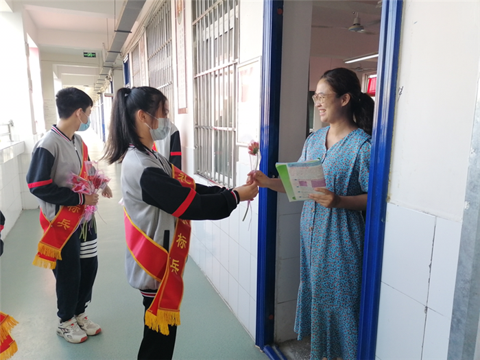 清晨,值班小礼仪同学等候在门口,为老师送上祝福。鲜花和赞美献给您,辛勤的园丁,愿园中的花更艳、更香,愿幸福和快乐与您常相随。同时,开展“我心中的最美老师”征文活动,学生用心感受老师们教学工作中的不平凡,用文笔发掘学校教师身上独特的人格魅力,字字句句都是真情实感。课间,播音员在“谢谢您,我亲爱的老师”栏目中播报同学们的祝福,学校的校园广播站课间全部开放,同学们纷纷来广播站向老师表白祝福。