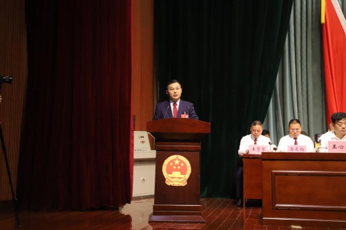 在热烈的掌声中,县长田庆杰代表西华县人民政府向大会报告工作。