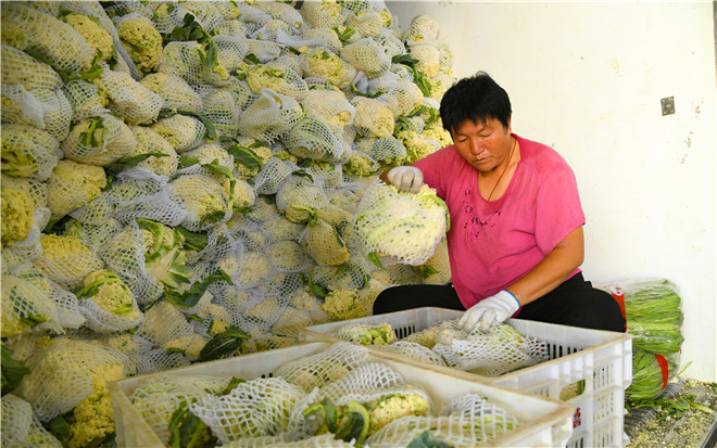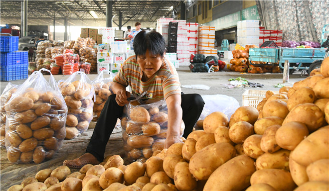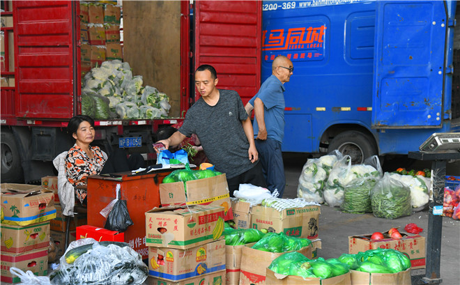 9月17日,黄淮大市场蔬菜批发区内,蔬菜批发商在进行蔬菜分装。