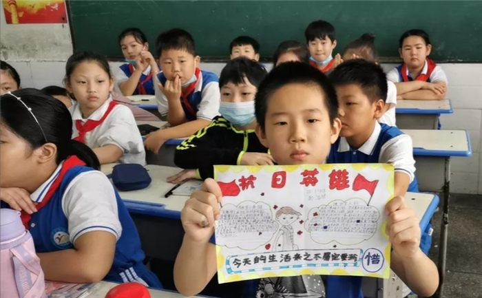队会课上,通过观看视频和辅导员老师的讲解,再现了“九一八”事变的真实场景,一张张枪林弹雨的历史照片,一个个血雨腥风的真实镜头,令每一个同学表情凝重,悲痛不已。在国难当头、民族存亡之际,一个个抗日英雄抛头颅、洒热血,践行着对祖国“一寸山河,一寸血!”的承诺。战士们不畏强敌,英勇献身的抗日精神深深激励着同学们的爱国心。队员们以诵经典、唱红歌、画手抄报等多种形式表达对英雄的纪念。