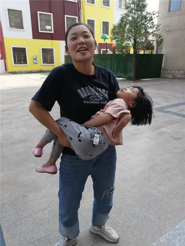 事情还要从一次课外活动说起,刚入园的小朋友们都开心的上着入园后的第一堂课外活动课,顺着小朋友玩耍的方向望去,只见小八班的李攀老师正在一边双手抱着一个睡着的小女生,一边带领孩子们进行课外活动。“小同学应该是刚睡着,看李攀老师还抱着拍着呢!”为了缓解胳膊的疼痛,李攀变换着各种姿势抱着她,孩子睡得更香了。