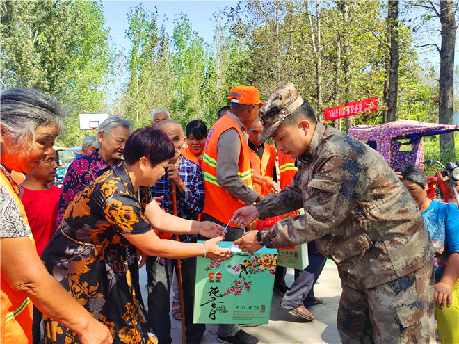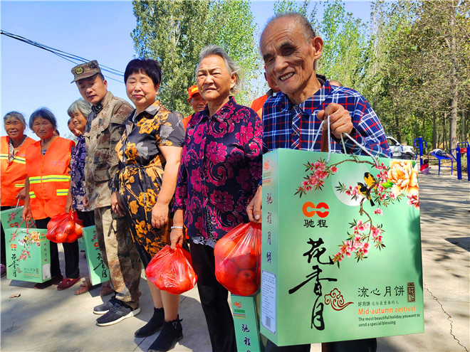 当日上午,秋阳明媚,轻风拂面,太康县高朗乡高庄村村西广场上,来自附近9个村庄的环卫工、残疾人、五保户等30位老人从一位50多岁爱心大姐张云英和其儿子乔新新手中接过月饼和苹果,连声说着“谢谢”。