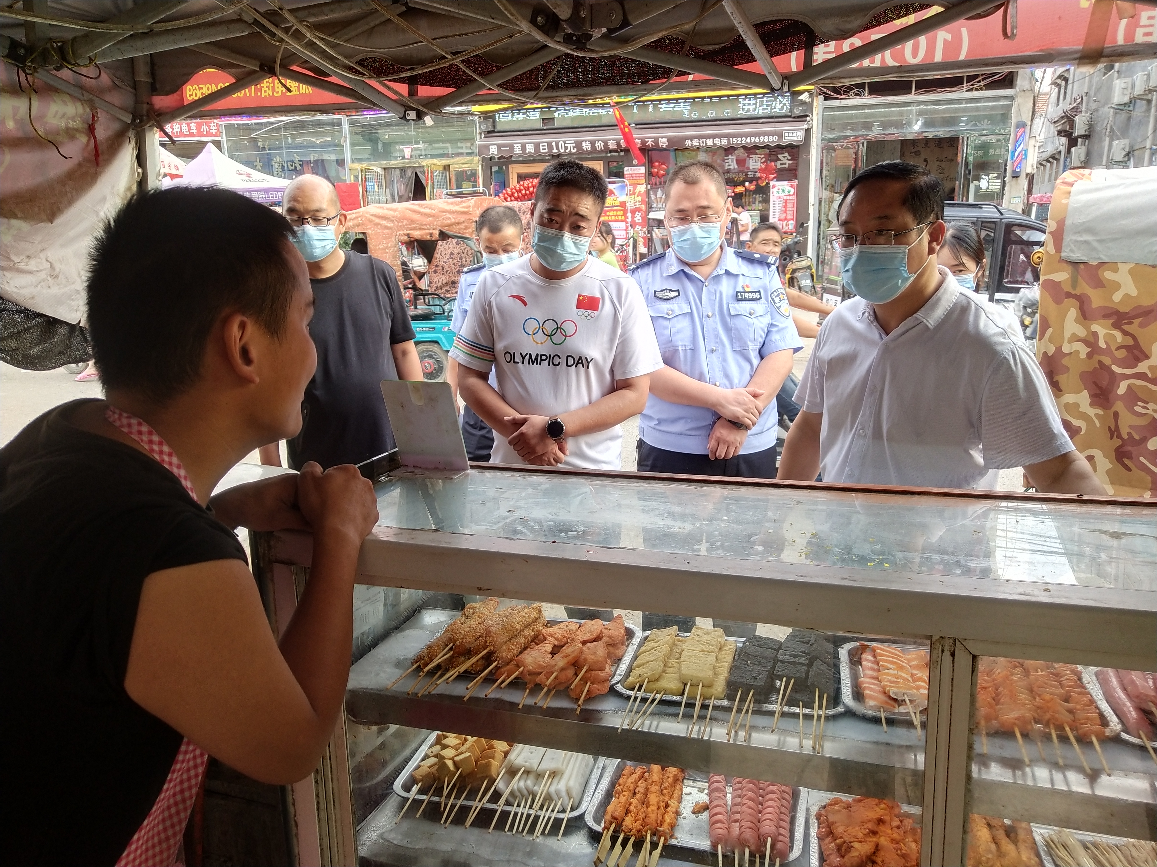 随后,段文海一行又来到“佰宜家”生活超市,重点检查了消防器材、应急安全设备以及疫情防控,指导超市负责人认真制定应急预案,完善工作举措,确保国庆假期安全稳定。“你们卖烤鸭使用液化气不安全,必须立即整改……”“你们做油炸鸡腿原料从哪采购的?占道经营不行啊……”在集市流动摊点,检查人员一针见血指出了存在的问题。“你们的电线老化、私拉乱扯有安全隐患必须尽快换掉,烟雾报警器没有安装到顶上需要重新调整位置,你讲讲如果发生火灾如何使用灭火器……”在集市沿街商铺暗访检查时,段文海等对一家床上用品专卖店业主提出严厉批评。派出所长苏丛博、副所长刘来自现场传授消防知识并给其下发了《限期整改通知书》。