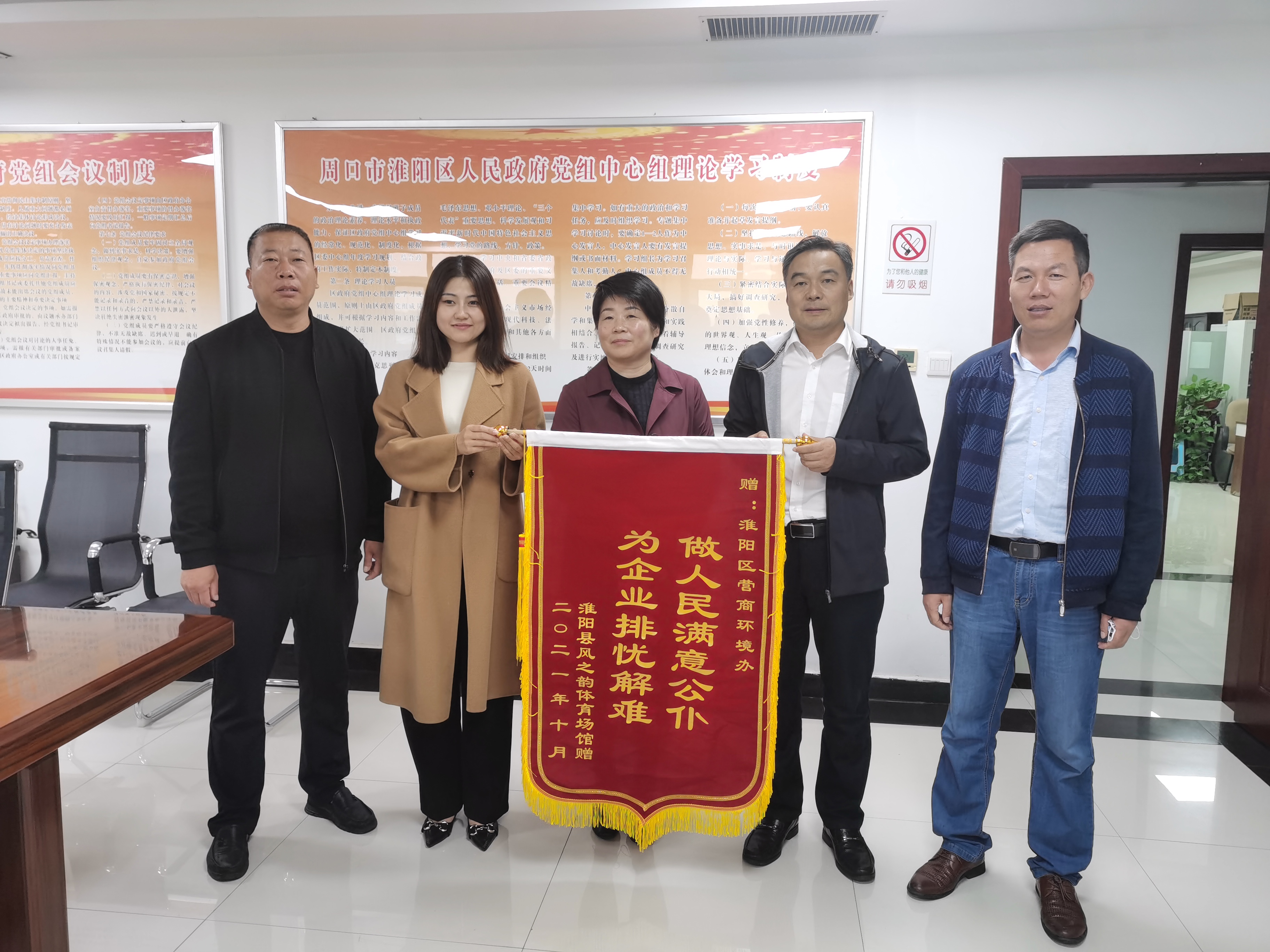 10月8日下午,淮阳区风之韵体育馆负责人把一面印着“做人民满意公仆 为企业排忧解难”的锦旗送到淮阳区优化营商环境办公室,对区营商办协调职能部门容缺办理,快速解决企业痛点难点问题表示感谢。