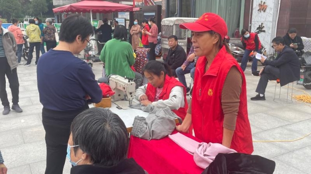 10月14日,在川汇区文昌大道的中原社区A区大门口,数十名身穿红马甲的志愿者在忙着帮社区老年人截裤脚、剪头发、补鞋子。志愿者们深入社区,为老年人服务。此外,他们还在莲花路、太昊路、文明路、交通路街头值勤,助力文明周口建设。