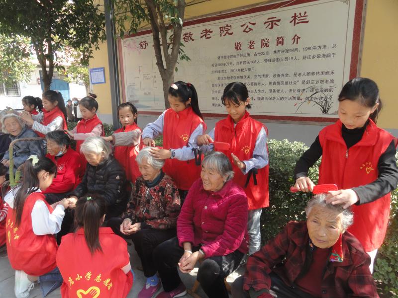 10月13日,商水县舒庄乡杜店小学的爱心志愿者来到舒庄乡敬老院为老人们梳头。为对学生进行爱老敬老教育,重阳节前夕,杜店小学组织20名爱心志愿者到乡敬老院为老人们打扫卫生、梳头、叠被。②13记者 付永奇 通讯员 乔连军摄
