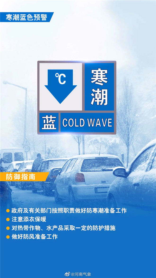 河南省气象台今日09时00分发布寒潮蓝色预警:预计未来48小时内,黄河以北和三门峡、洛阳、平顶山、漯河、许昌、郑州、开封、周口、商丘九地区及驻马店地区西部、南阳地区北部最低气温将下降8到11度;17日早晨,上述大部分地区最低气温将降至2到4度,高海拔山区可达0度左右。今天夜里到明天,全省大部分地区偏北风4到5级,阵风7级左右。请注意防范。
