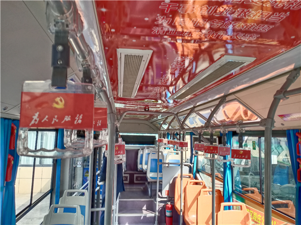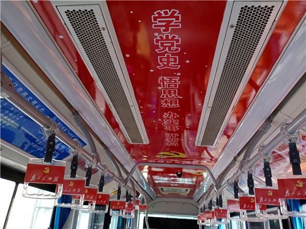 图片说明:10月25日,记者在周口市公交总公司院内看到,一辆车头前印有“红色主题班线”标识的公交车格外引人注目,虽然该车的外形与其他车差别不大,可是车厢内贴满了红色标语口号,给人耳目一新的感觉。记者看到,车厢内的扶手、座椅及车顶上都贴有“为人民服务”“学党史、悟思想、办实事、开新局”“革命小故事”等宣传内容。③2