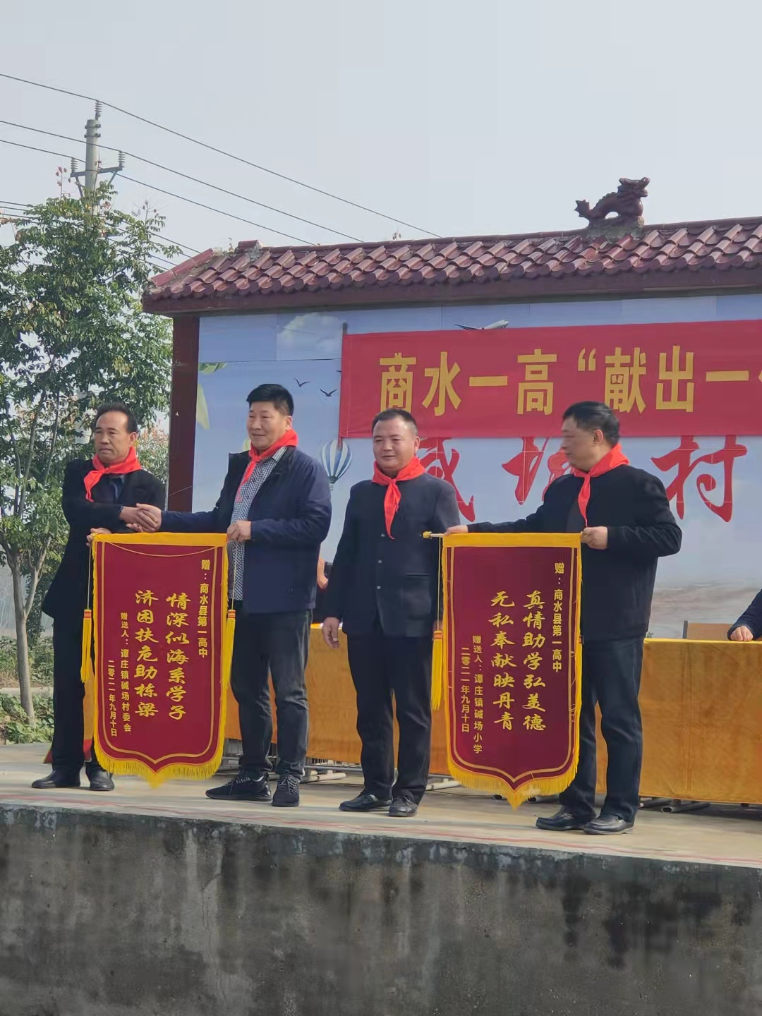 谭庄镇碱场村村委会、谭庄镇碱场小学分别向商水一高赠送内容为“真情助学弘美德,无私奉献映丹青”“情深似海系学子,济困扶危助栋梁”的锦旗。